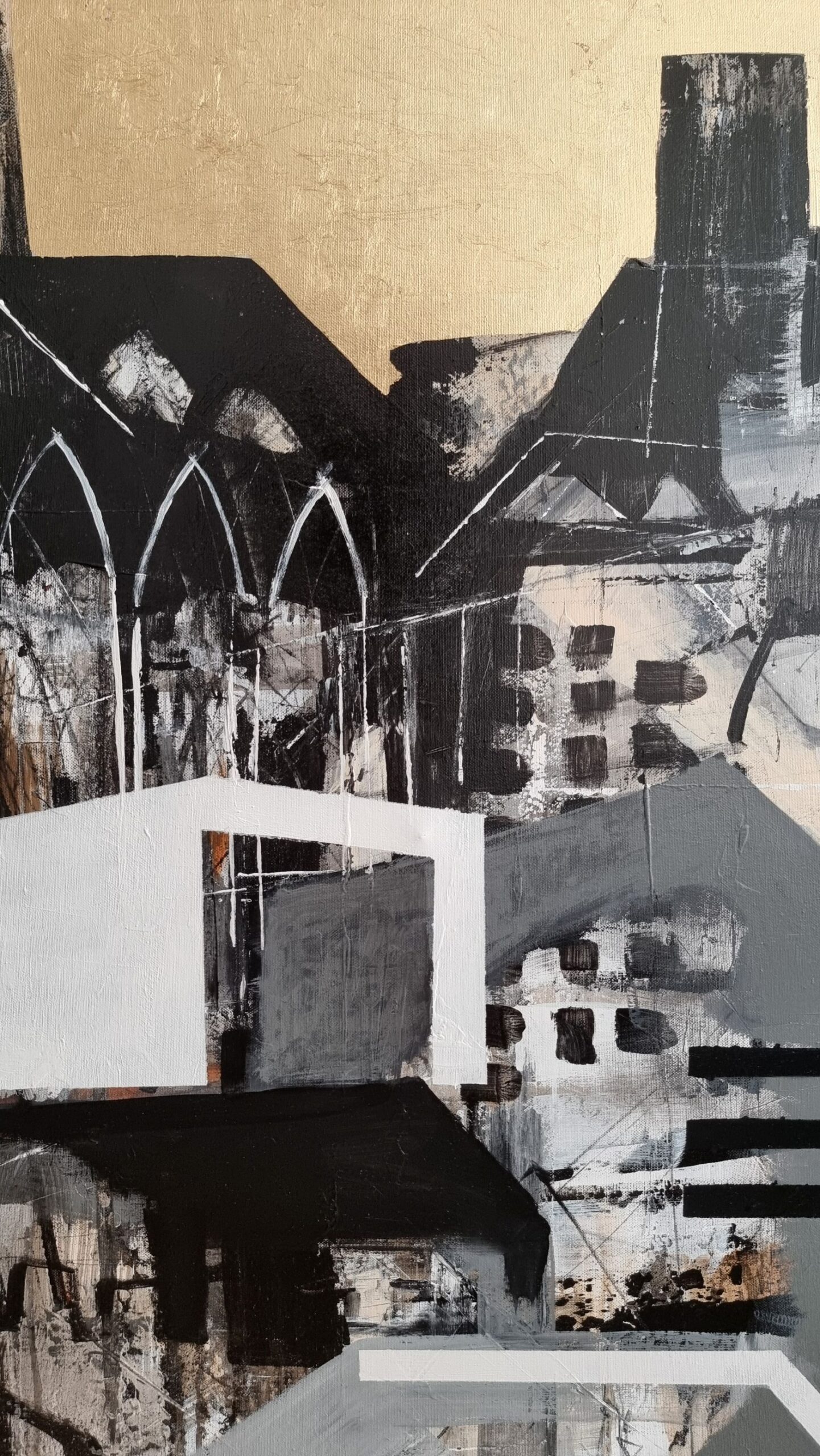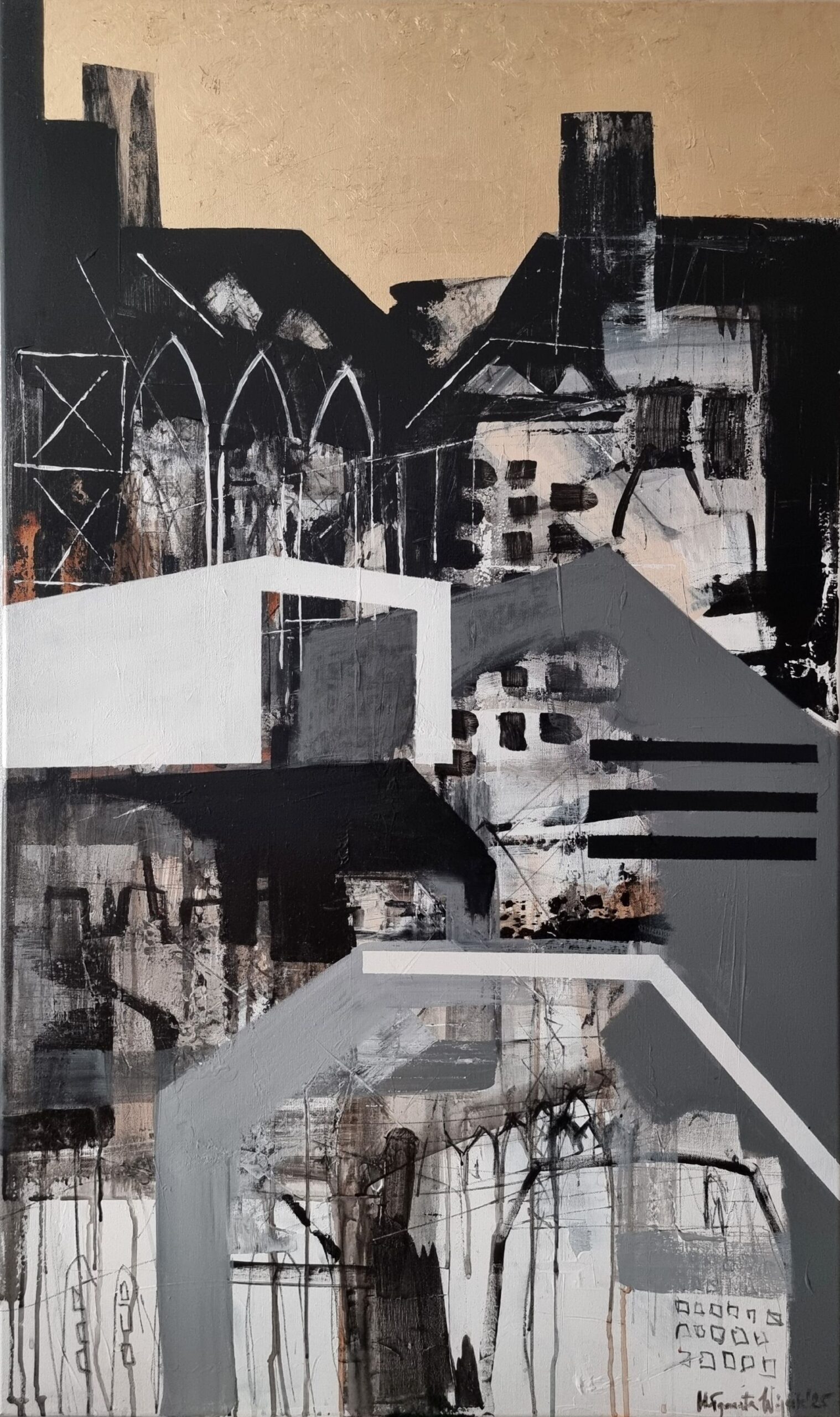 178. Małgorzata Wójcik, 2025, cykl złote miasto, 120×70 cm, akryl na płótnie, szlagmetal, zabezpieczony werniksem, sygn. p.dół i na odwrociu